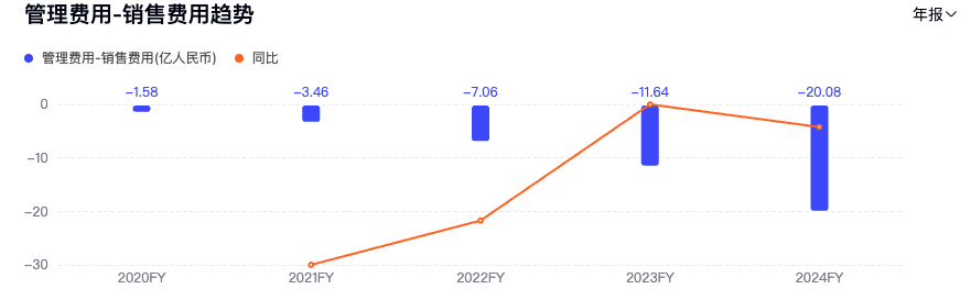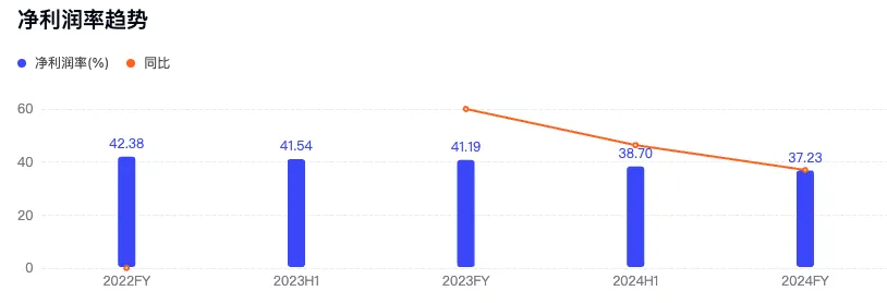 财报显示,公司销售费用率从2019年9.80%上升到2024年的34.25%。2024年销售及营销开支从11.64亿元上升到20.08亿元。且增速远超收入增幅。过高的销售费用也对净利润有所蚕食,导致公司净利润率从2019年的60.1%下滑至2024年37.22%。