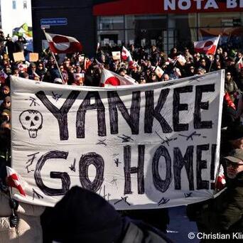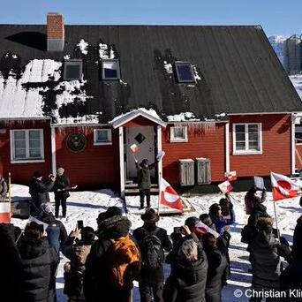 人们集会,挥舞岛旗和醒目的标语,要求美国撤离格陵兰岛。